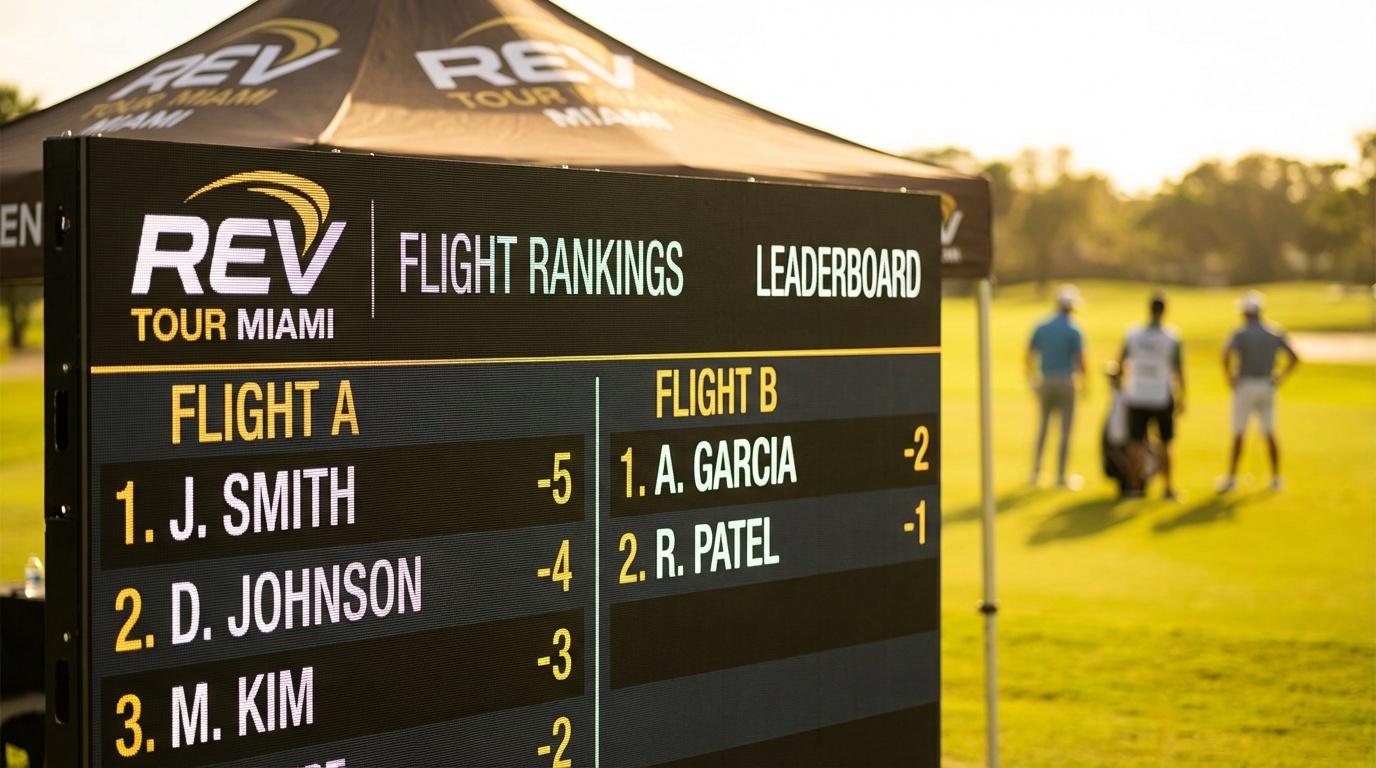 The Rev Tour Miami operates on an 8-week seasonal format with three competitive phases. Local rounds across Miami-area courses lead to regional qualifiers. Regional winners advance to national events. All rounds follow USGA rules. Handicaps verified through GHIN. Scoring integrity is non-negotiable.